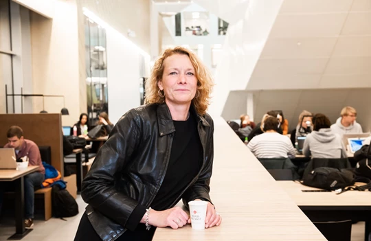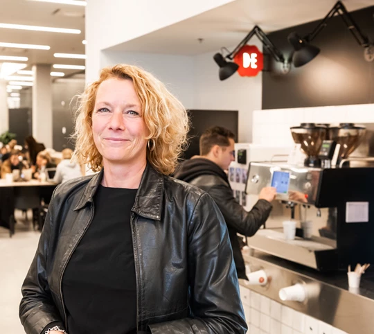 Samen met de marketingafdeling bedenkt ze daarom regelmatig een leuke actie of enquête. “Koffie is vreselijk belangrijk op de hogeschool”, zegt Timmer. “Als er een storing is bij een van de automaten, dan ontploft mijn mailbox.” Met koffie is het net als met eten, merkt ze op. “Iedereen vindt er wat van. Én het verbindt. Studenten, docenten en medewerkers treffen elkaar bij de koffiemachine.” Haar eigen favoriete koffiemoment? “Dat is ’s morgens, tot tien uur. Dan drink ik twee, drie koppen zwarte koffie. Uit één herbruikbare beker, natuurlijk.”