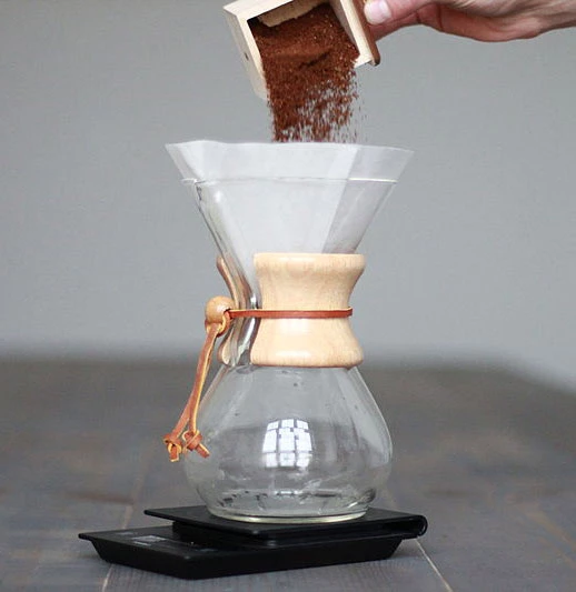 Een koffieapparaat dat bedoeld is voor de Chemex-methode lijkt afkomstig uit een scheikundelokaal. Dit komt omdat het iets weg heeft van een zandloper.