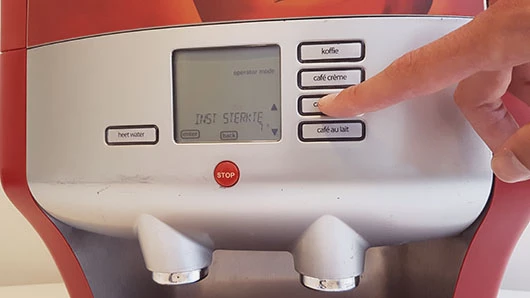 Druk op de koffietoets rechtsonder om naar ‘Inst sterkte’ te gaan en vervolgens op de heetwaterknop (linksonder) om deze keuze te bevestigen.