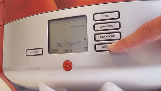 Je gaat naar het operator menu door de stoptoets en de bovenste koffietoets gelijktijdig in te drukken. Je ziet nu op het display: ‘Operator mode, lees teller’.