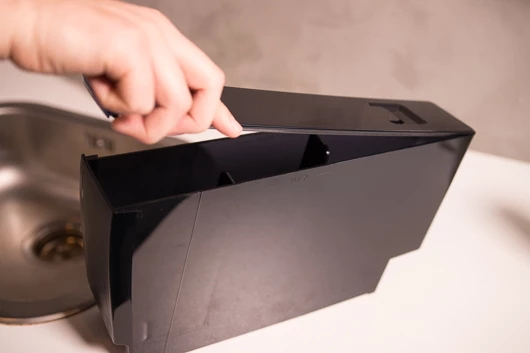 Haal de deksel van de watertank. Dat vult makkelijker in de volgende stap.