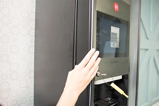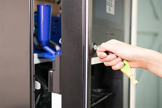 Open de deur van de koffiemachine. Draai de sleutel hiervoor naar rechts.