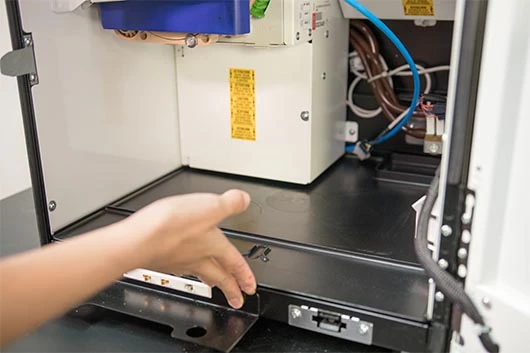 Schuif de ingrediëntencontainers terug in de koffiemachine en duw de uitlooptuitjes weer omlaag. Als uw suikercontainer aan de rechterkant zit, plaats deze dan als laatst volgens de instructie van stap 21 en 22. Anders kunt die stappen overslaan.