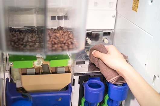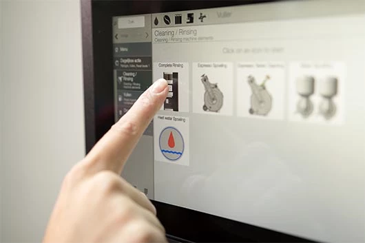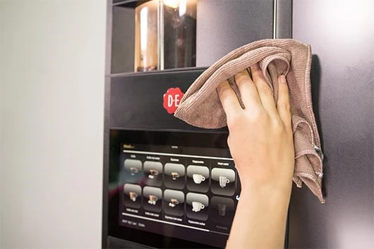 Zodra het spoelprogramma klaar is, kun je een vochtige doek over de buitenzijde van de Espresso Omni halen.