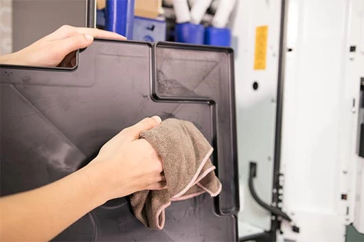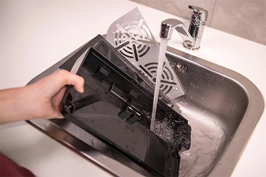 Haal het rooster en de deksel van de lekbak en spoel alle onderdelen schoon onder de kraan met warm water. Droog ze daarna goed af.
