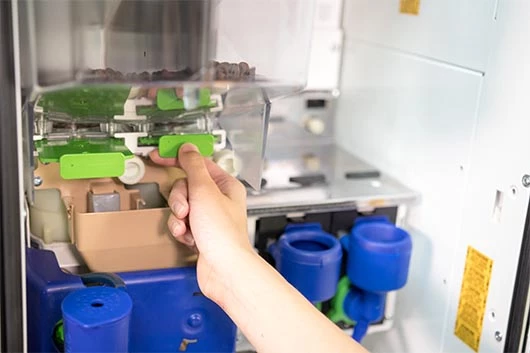 Zet ook de koffiecontainer terug. Pak de container met twee handen vast om te herplaatsen. Trek de groene schuif van de koffiecontainer naar je toe om de openingen vrij te maken.