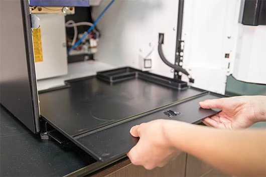 Schuif de zwarte bodemplaat met twee handen uit de koffiemachine.