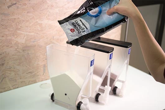 Zet de ingrediëntencontainers op een tafel en haal de deksels eraf. Vul de containers met de juiste ingrediënten.