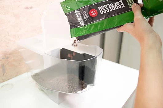Open de deksel van de koffiecontainer voor gemalen koffie en/of koffiebonen. Je kunt nu de koffiebonen of gemalen koffie toevoegen.