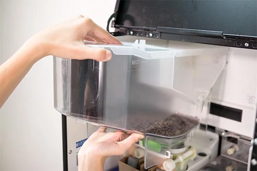 Open de deksel van de koffiecontainer voor gemalen koffie en/of koffiebonen. Je kunt nu de koffiebonen of gemalen koffie toevoegen.