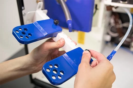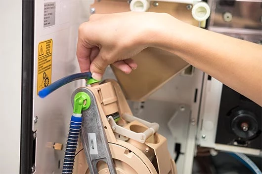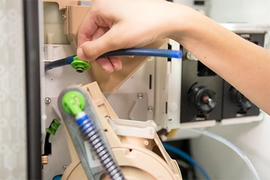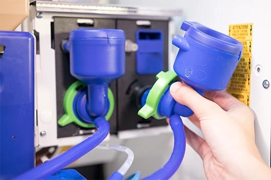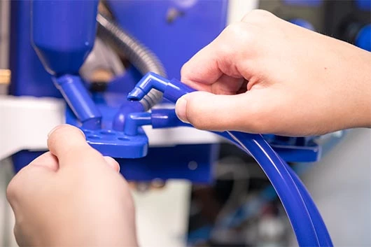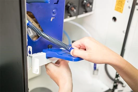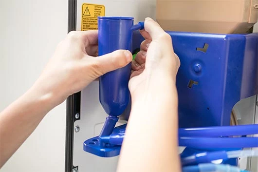 Zorg bij het plaatsen van de mengbeker dat het pijpje in het middelste gat van het blauwe frame valt en sluit de mengbeker weer op het slangetje aan.
