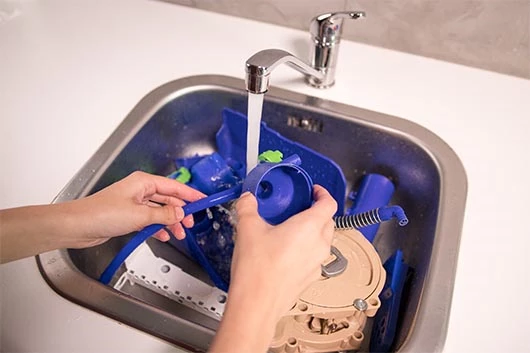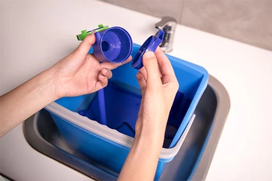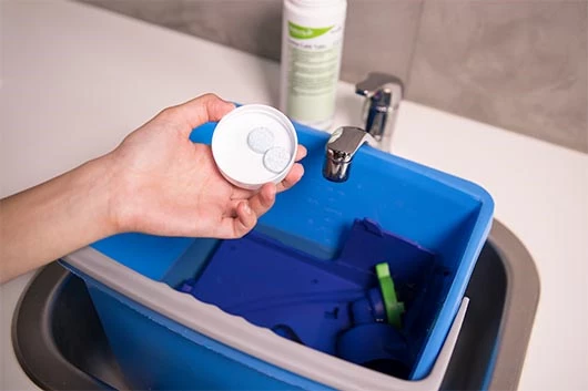 Haal alle blauwe onderdelen uit elkaar en doe ze met tenminste 4 liter heet water in een grote emmer of spoelbak.