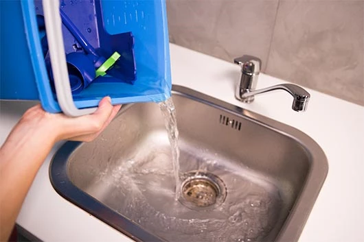 Gooi de emmer of spoelbak leeg in de gootsteen. Gooi het water niet over jouw handen (bekijk de veiligheidsvoorschriften op de verpakking van de Suma Café tabs).