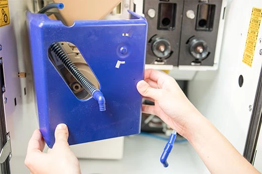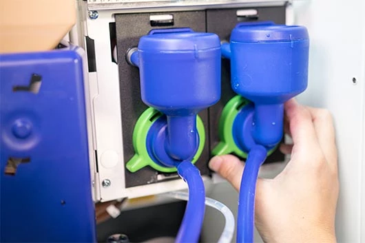Duw vanaf de onderkant met uw vinger de mengbeker (de blauwe koker) omhoog en uit de koffiemachine en trek het slangetje los.