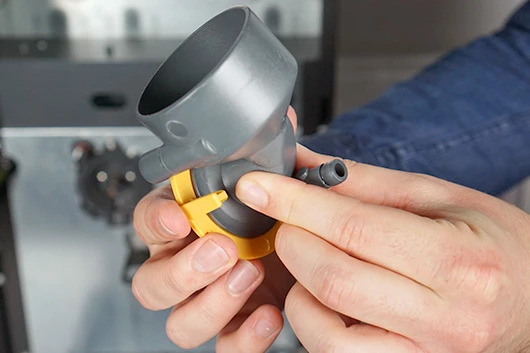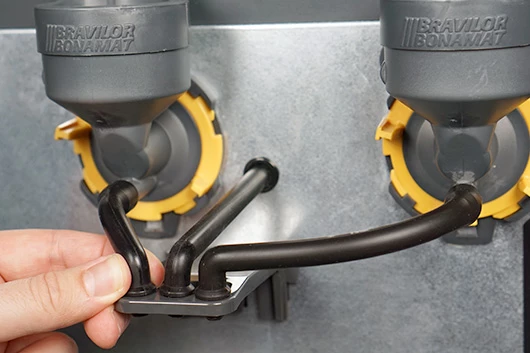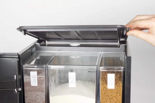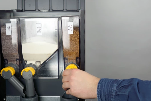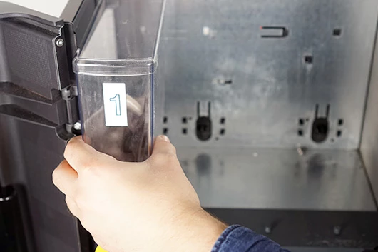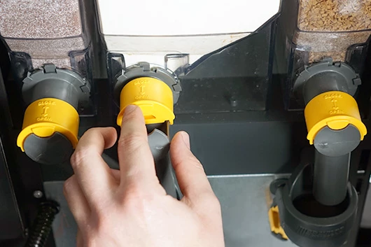 Plaats de containers terug. Zorg dat de uitgiftetuiten goed in de mengbekers vallen. De gele uitlopen kun je naar voren trekken om de ingrediënten open te zetten voor gebruik.