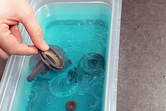 Los een Suma Café Tab op in een bak met lauw water. Plaats vervolgens alle mixeronderdelen in het bakje. Laat ze ongeveer 15 minuten weken.