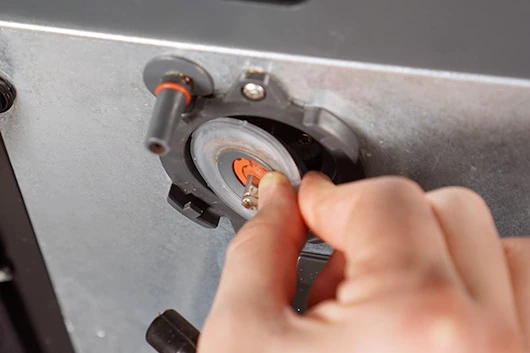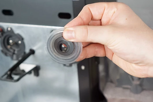 Op de plek waar je de mengbekers heeft verwijderd, zitten een aantal losse onderdelen die je eraf kan halen. Trek de mixervin (het propellor-achtige onderdeel) uit de koffiemachine, dit kan stevig vastzitten.