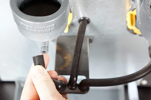 Trek voorzichtig de uitgifteslangen van de mengbekers af.