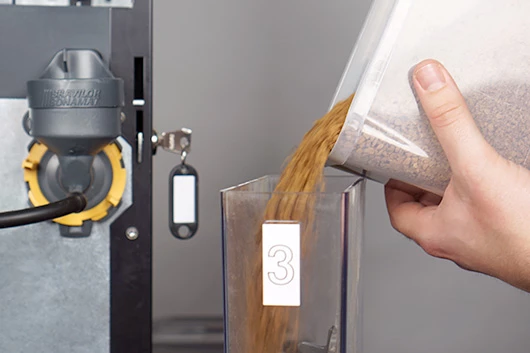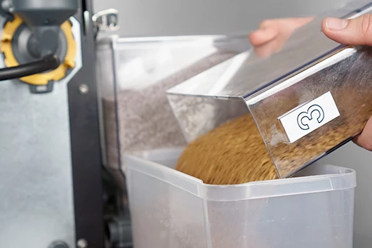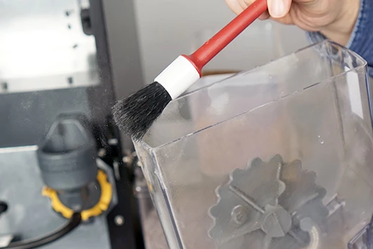 Maak de containers en uitgiftetuiten met een kwastje schoon. Gebruik geen water. Het is namelijk lastig om de onderdelen goed droog te krijgen. Vocht kan ervoor zorgen dat de ingrediënten gaan klonteren.