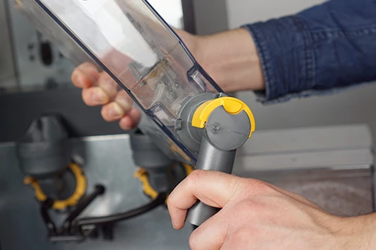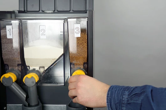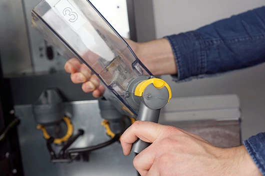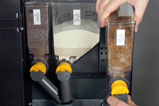 Plaats de containers terug. Zorg dat het uitgiftetuiten goed in de mengbekers vallen. De gele uitlopen kun je naar voren trekken om de ingrediënten open te zetten voor gebruik.
