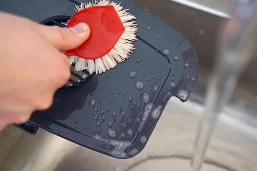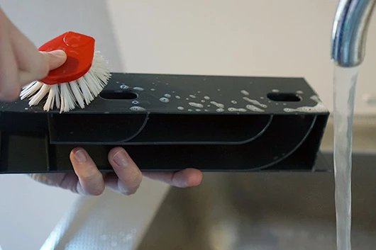 De ingrediëntenhouder maak je schoon met warm water en afwasmiddel. Spoel de houder goed af en droog hem daarna met een schone droge doek.