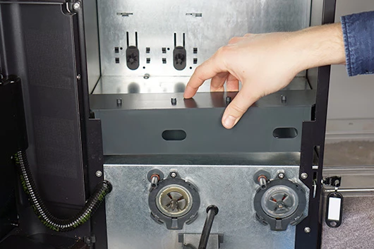 De buitenste rand van de uitgiftetuit heeft een aantal inkepingen. Draai de uitgiftetuit zo dat de inkepingen aansluiten op de uitstulpingen om de uitgiftetuit los te halen.