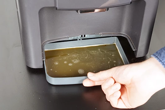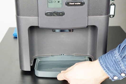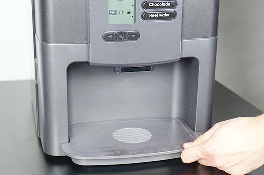 Neem de lekbak voorzichtig uit de koffiemachine. Zorg dat je geen vloeistof knoeit.