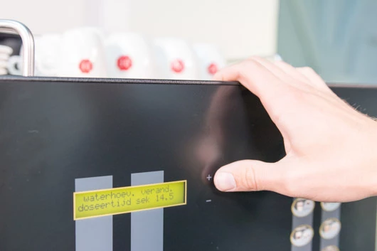 Druk op de heet water-toets op de frontdeur. Er staat nu ‘waterhoev. verand. doseertijd ##.# sec’ op het display.