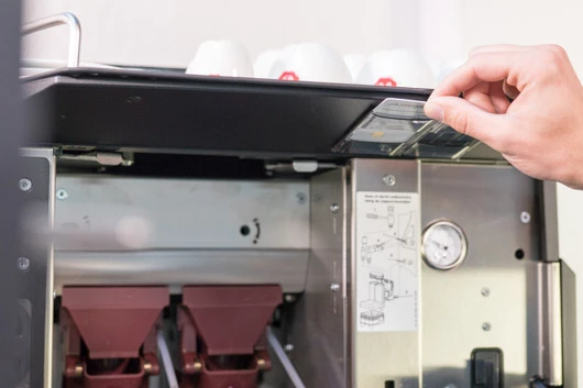 Als de frontdeur van jouw koffiemachine geopend is, zie je aan de bovenkant twee plastic houders. Bewaar hier jouw chefkaart zodat je deze niet verliest.