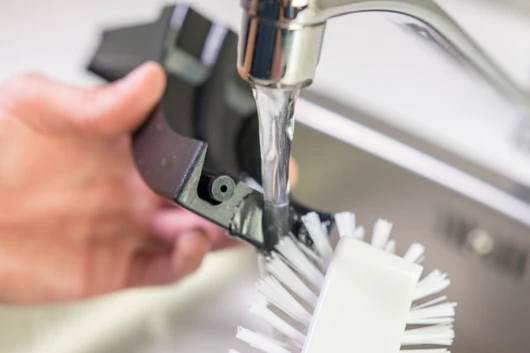 Maak de uitlooppijpjes schoon met het ragertje. De buitenkant van de koffie-uitlopen kun je het best met een afwasborstel onder de kraan schoonmaken. Spoel ook de uitlopen goed door. Let op: de onderdelen mogen niet in de vaatwasser!