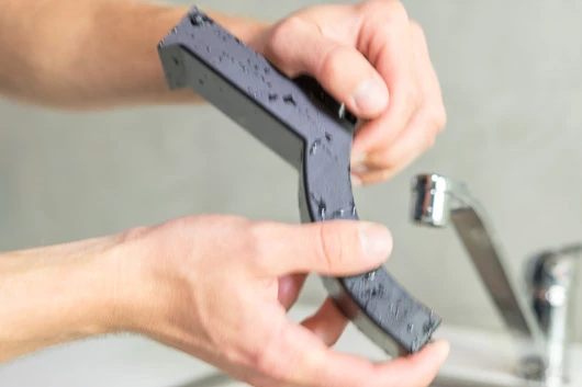 Plaats de palm van jouw andere hand op het grote gat van de koffie-uitloop en schud het geheel flink. Zo raakt eventueel vastgekoekt vuil weer los. Het water laat je via het grote gat uit de trechter lopen. Spoel het geheel nogmaals onder warm stromend water.