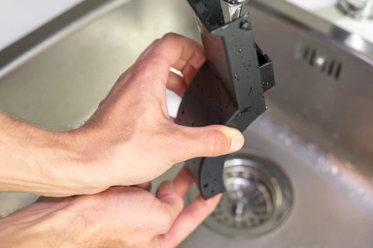 Plaats de palm van jouw andere hand op het grote gat van de koffie-uitloop en schud het geheel flink. Zo raakt eventueel vastgekoekt vuil weer los. Het water laat je via het grote gat uit de trechter lopen. Spoel het geheel nogmaals onder warm stromend water.